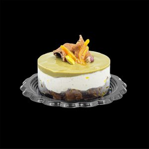 Semifreddo alla mandorla su biscuit al cioccolato con croccante e glassa al pistacchio.